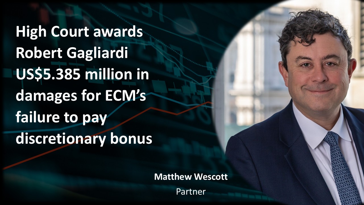 The Court’s decision ultimately turned on the construction of Mr. Gagliardi’s contract with ECM. Mr. Justice Calver considered the text and circumstances of the contract in detail and found that the contract was unambiguous: the only factor ECM was contractually entitled to take into account in deciding the amount of Mr. Gagliardi’s discretionary bonus was the trading revenue he had generated. If profit was generated, then Mr. Gagliardi was entitled to a Discretionary Bonus in the range of 10-15% of that profit.