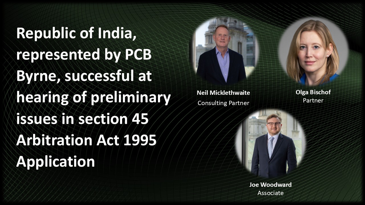 The Republic of India was represented by PCB Byrne LLP in the s. 45 Application. The team was led by Neil Micklethwaite, Olga Bischof and Joe Woodward and instructed Andrew Green KC, Peter Head, and Myron Phua of Blackstone Chambers.