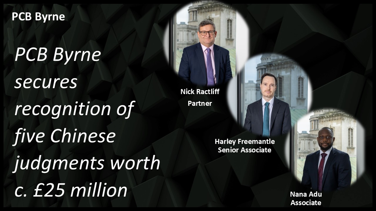 PCB Byrne has secured the recognition in England and Wales of judgments of the courts of the People’s Republic of China (“PRC”) worth more than RMB 240 million (c. GBP 25 million).